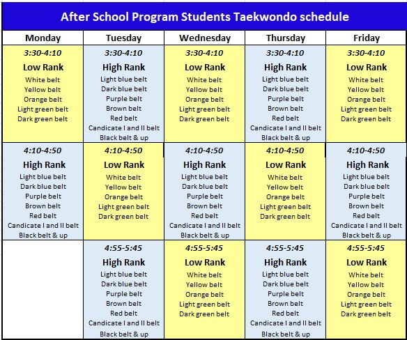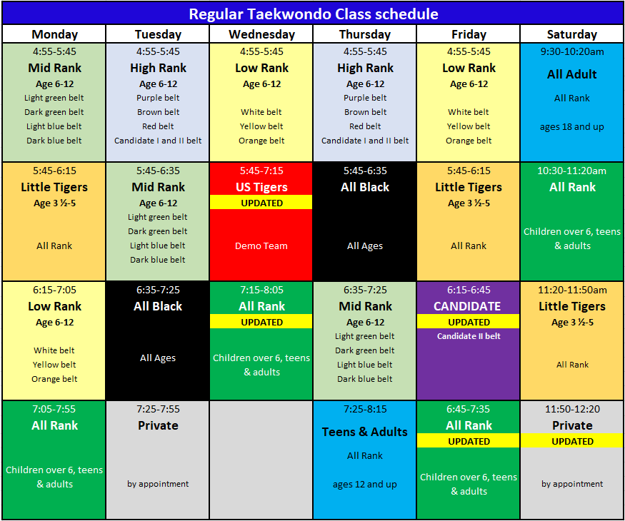 TAE KWON DO - WEEKLY CLASS SCHEDULES